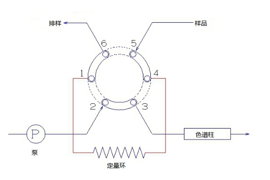 當(dāng)六通閥手柄處于“Load”位置時(shí)流路“2-3”、“6-1”相通,4口與進(jìn)樣口相通,5口處于截止?fàn)顟B(tài);轉(zhuǎn)動手柄至“Inject”位置時(shí)流路“1-2”、“3-4”相通,4口處于截止?fàn)顟B(tài),5口與進(jìn)樣口相通。